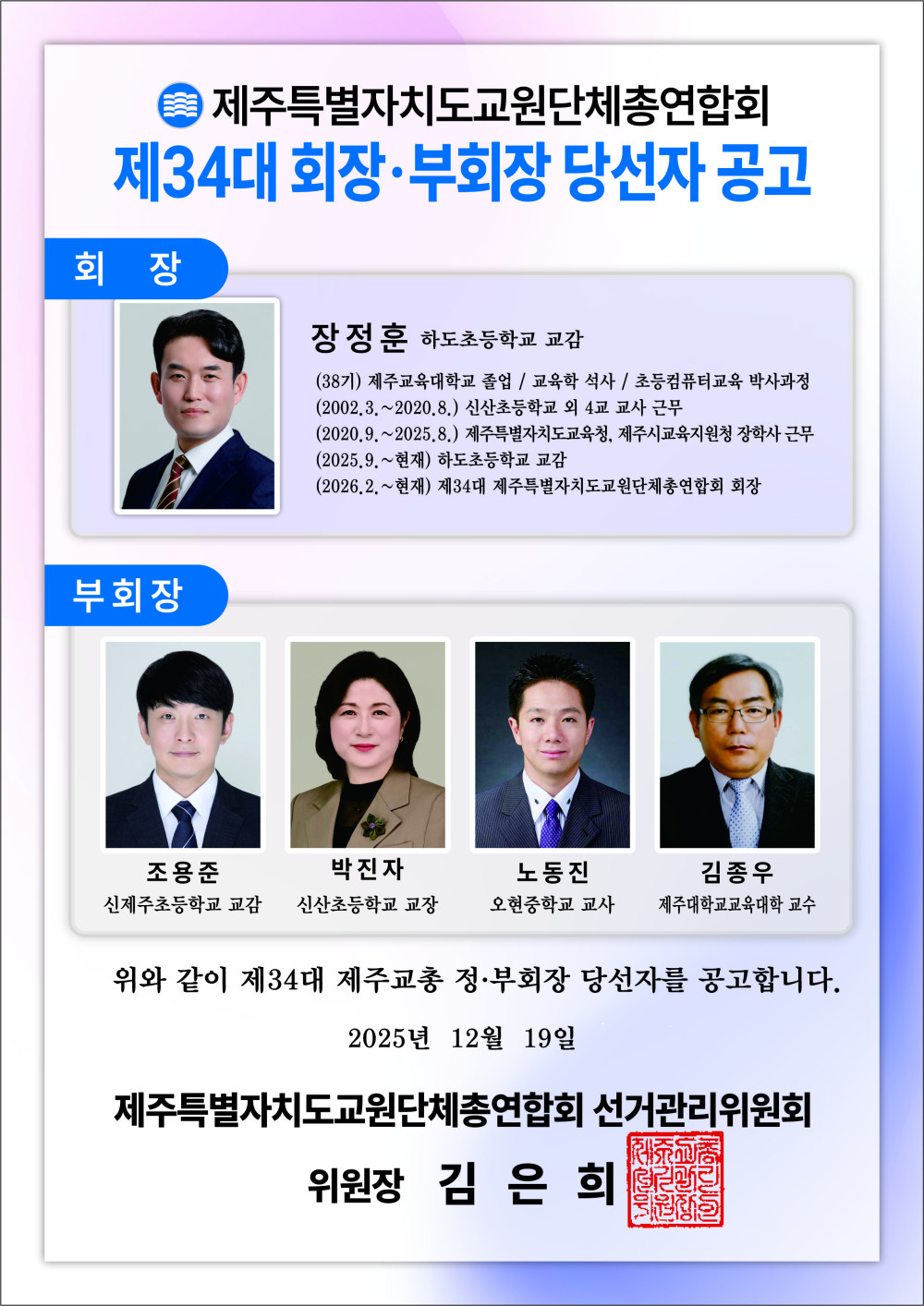 제주교총 제34대 회장단은 2025년 12월 19일 자로 무투표 당선이 확정되었고,